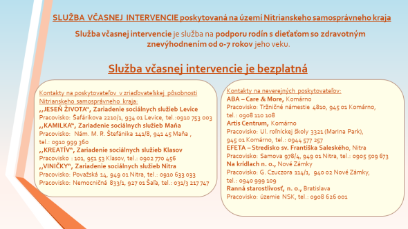 Služba včasnej intervencie je služba na podporu rodín s dieťaťom so zdravotným znevýhodnením od narodenia do siedmich rokov jeho veku. Včasná intervencia stavia na silách a schopnostiach členov rodiny. Snaží sa umožniť rodičom podporovať vývin dieťaťa tak, aby dokázalo čo najviac využiť svoje možnosti, schopnosti a predpoklady. Informácie na webovom sídle NSK: https://www.unsk.sk/zobraz/obsah/10546